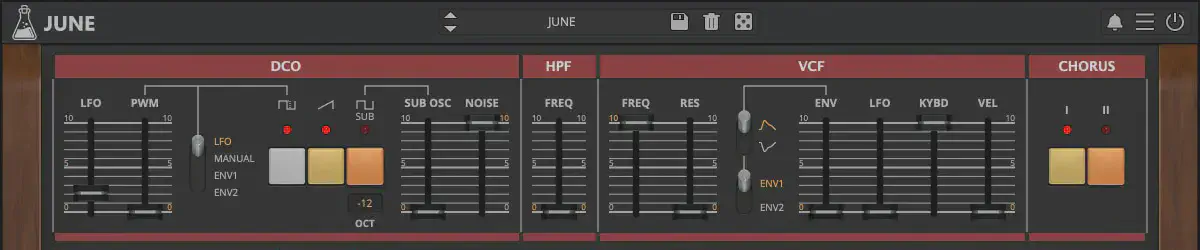 JUNE is a faithful emulation of the Roland JUNO-60, one of the most iconic polyphonic analog synthesizers from the early 1980s.
