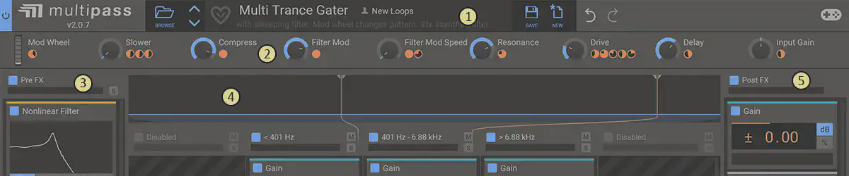 MultiPass is a multiband modular Snapin Host which splits the incoming signal into up to five frequency ranges which can have effects chains added to them separately.
